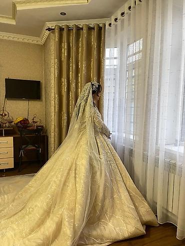 - Верх: закрытый лиф с круглым вырезом и длинными рукавами, декоративная вышивка и сияющие элементы по всей поверхности