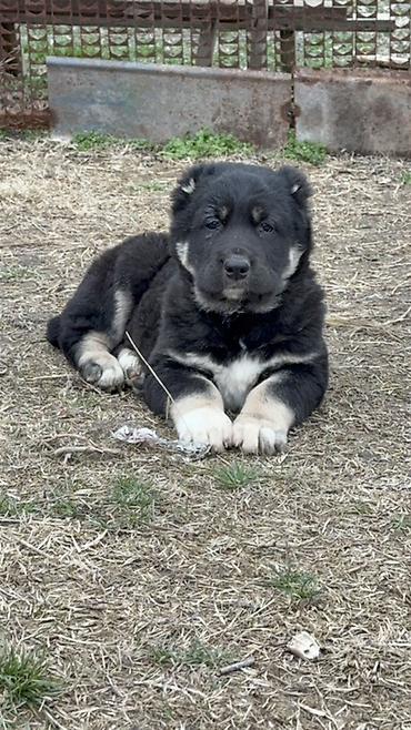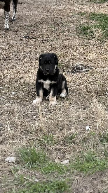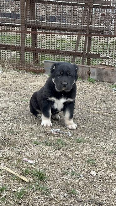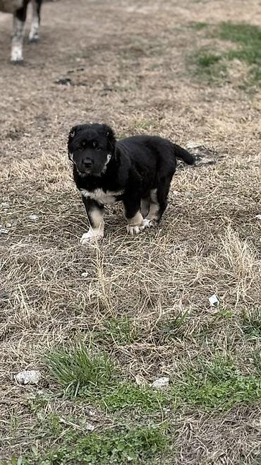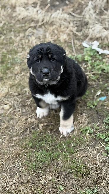 Щенок крупной породы, черного окраса с белыми и светло-подпалыми отметинами. Плотный костяк, широкая грудь, мощная голова, короткие уши, густая шерсть. Спокойный, уравновешенный темперамент, внимательный к человеку. Отлично подойдёт для охраны подворья и двора, быстро осваивает территорию, уверенно держится на улице.