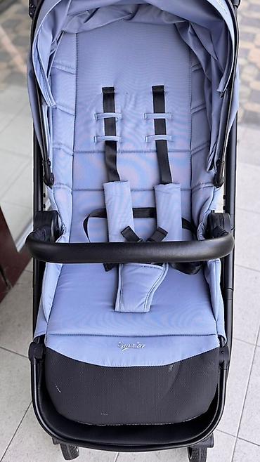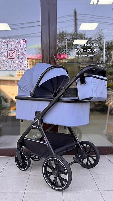 Детская коляска 2-в-1 (люлька + прогулочный блок) в небесно-голубом цвете.