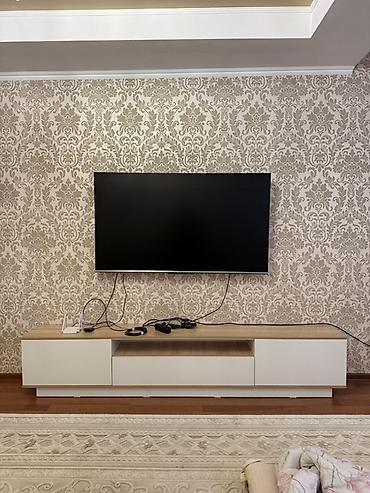 - Размеры: габариты тумбы на фото — удлиненная модель для гостиной (ориентировочно на ширину около 180–200 см; центральная ниша рассчитана на стандартную аудио/видео технику).
