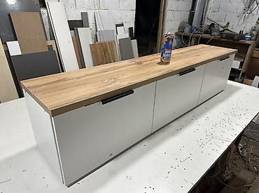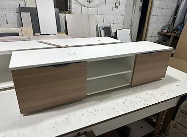 В комплекте: тумба с полками и фасадами; предусмотрены технологические вырезы под кабели. Возможны варианты исполнения с полками/ящиками, как на фото.
