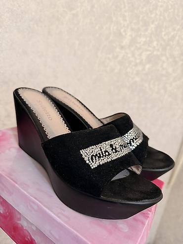 1. Женские замшевые туфли-босоножки. Цвет стальной или светло-серый. Посередине лента растягивающая и удерживающая. Каблуки 9 см. Размер 36. Состояние идеальное. 1400 сом 2. Женские нарядные комби...