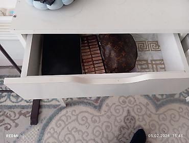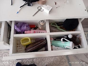 - Две выдвижные тумбы/ящика по всей ширине: один с секциями-органайзерами для косметики и аксессуаров, второй — глубокий для приборов и крупных вещей.