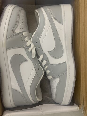 Кроссовки низкие в стиле Jordan/Nike, цветовая гамма: белый + светло‑серый.