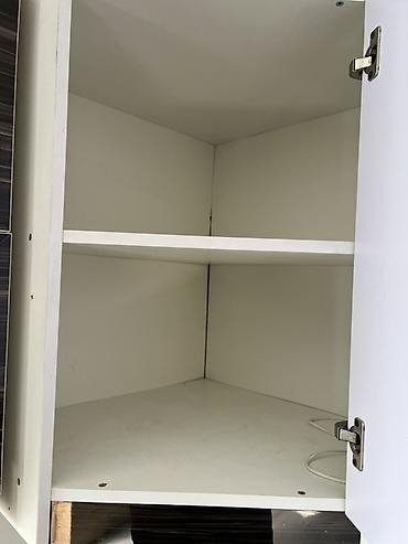 - Верхние шкафы с распашными дверцами, внутри полки; один угловой кухонный модуль для максимального использования пространства.