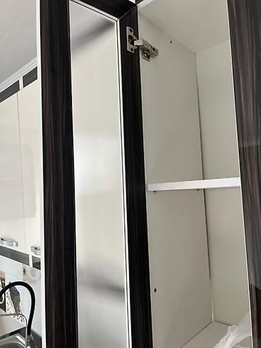 - Фасады комбинированные: белые глянцевые и темные под древесную текстуру, горизонтальные хромированные ручки.