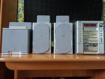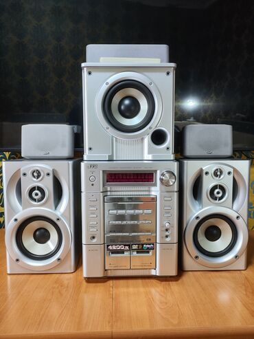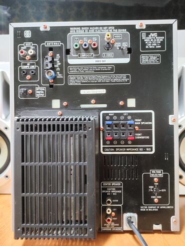 - Центральный канал (горизонтальная колонка) и тыловые/сателлиты JVC для многоканального звучания.