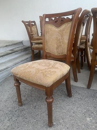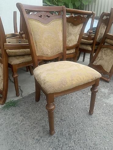 - Стулья в классическом стиле с резным верхом спинки. Каркас из дерева, мягкое сиденье и спинка с тканевой обивкой с жаккардовым узором в бежево‑золотистых тонах. Точеные передние ножки, декоративные гвоздики по контуру обивки.