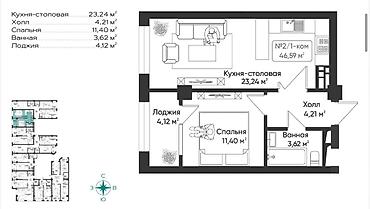1 комнатная квартира 47,6 м^2 ул. Ленина #12 блок#3 мкр Аламедин 1, сдачи в эксплуатацию под ключ.