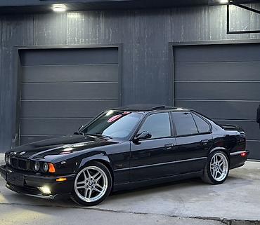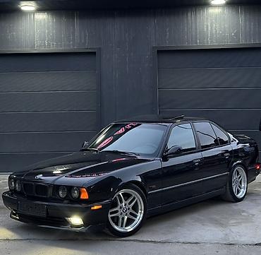 BMW 5 Series (E34) седан, тёмный цвет кузова. Ключевые особенности: - Классический дизайн E34 с фирменной решёткой и четырёхглазой оптикой - Литые оригинальные диски BMW - Тонированные стёкла - Аэ...