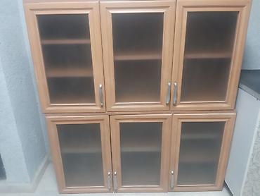 Кухонные навесные шкафы, цвет «бук/вишня светлая».б/у 10000 сом находится в Ноокате Состав комплекта: - Две секции с распашными фасадами, фигурные вырезы под стекло/витрину. - Одна глухая секция с...