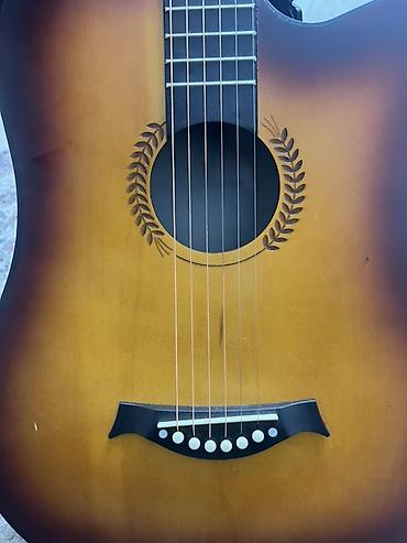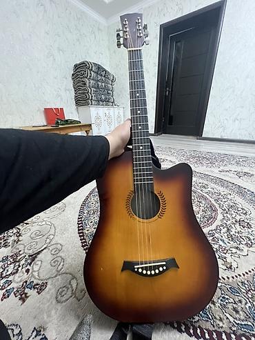 Акустическая гитара с вырезом (cutaway), форма корпуса Dreadnought. Красивый санбёрст‑окрас, декоративная резьба вокруг розетки в виде лавровых ветвей.