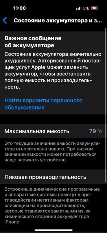 - Максимальная ёмкость — 79%. Рекомендована замена аккумулятора для восстановления полной производительности.