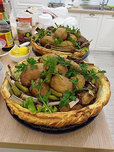 - Большой блюдце‑казан с сочным мясом и молодым картофелем, запечёнными до мягкости, с рёбрышками и крупными кусками мяса.