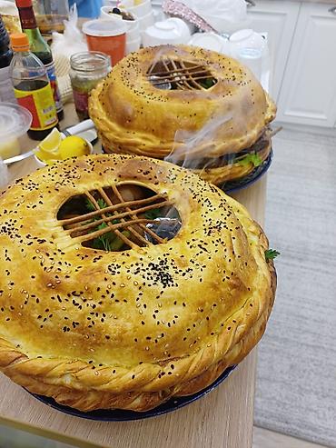 - Подача под золотистой хрустящей крышкой из теста с кунжутом и нигеллой; сверху декоративная решётка, в центре отверстие для выхода пара.