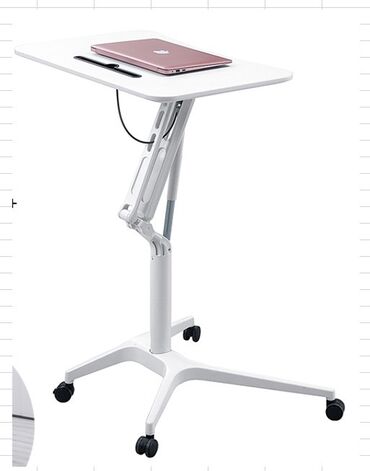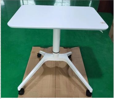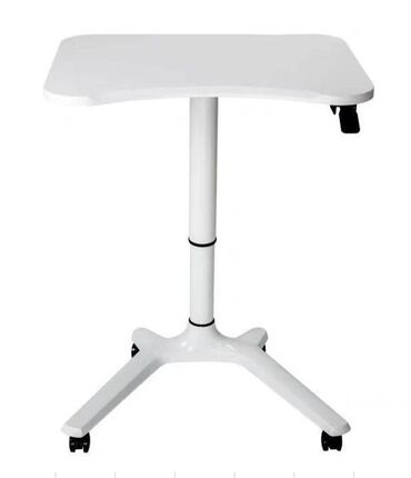 - Компактный мобильный стол на крестовидном основании с поворотными роликами. Газлифт/механическая регулировка по высоте с рычагом под столешницей (работа сидя/стоя, bedside/презентационный формат).