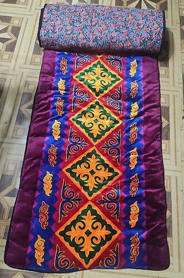 - Төшөк/коврик/мат: яркий двусторонний стёганый коврик. Размер 75см х 285см. Одна сторона — насыщенный восточный орнамент (бордовый, синий, жёлто-оранжевые и зелёные элементы), другая — цветочный принт. Можно использовать как напольный мат, плед для пикника, детский игровой коврик или дополнительный слой тепла на диван/кровать. Сворачивается в рулон для хранения.