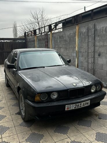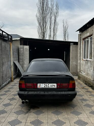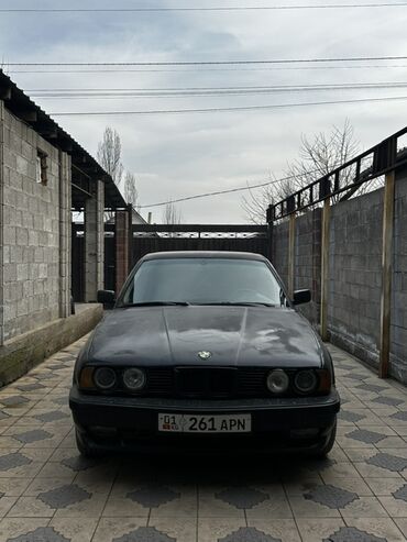 BMW 5 Series (E34) седан, черный цвет, на киргизских номерах (01 KG 261 APN). Кузов с фирменной «акульей» передней частью и круглыми двойными фарами. Тонированные стекла, задний небольшой спойлер на крышке багажника. Сзади — сдвоенный выхлоп (двухтрубная выпускная система). Литые диски, боковые молдинги, оригинальная решетка радиатора.