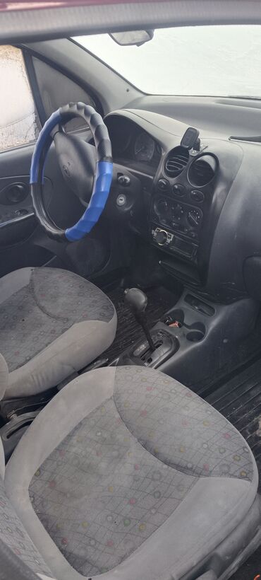 Daewoo Matiz, 5‑дверный хэтчбек, бордовый. Салон светло‑серый тканевый, узорные сиденья. Панель с круглыми воздуховодами, блок управления отопителем/вентиляцией и магнитола 1‑DIN. Коробка автомат (селектор на тоннеле), ручной стояночный тормоз. Электростеклоподъёмники спереди (кнопки на дверях), центральная консоль с подстаканниками и нишами. Трёхспицевый руль с чехлом, крепление под смартфон на торпедо. Задняя дверь с стеклоочистителем. На крыше установлены поперечины багажника. В багажнике ниша под запасное колесо и домкрат, запаска на штампованном диске в комплекте. Номер на фото: М2560В 150 RUS.