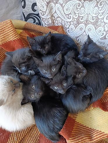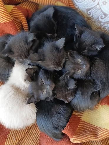 - Окрас: преимущественно чёрный/дымчатый, есть один светлый (кремовый) с голубыми глазами.