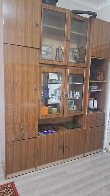 - Секции: нижние тумбы с распашными дверцами, несколько выдвижных ящиков, центральная ниша под ТВ/декор, верхние шкафы со стеклянными дверцами и полками, боковые закрытые и открытые отделения.