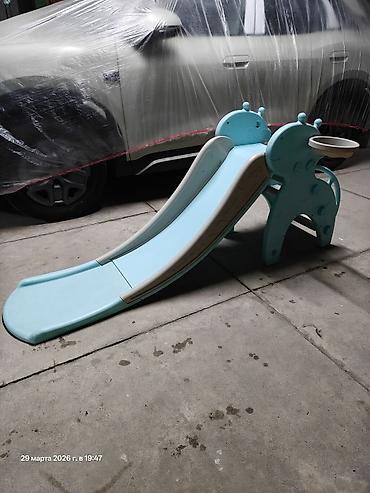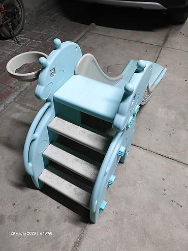 - Компактный игровой комплекс для дома и двора: горка + лестница + кольцо для мини-баскетбола.