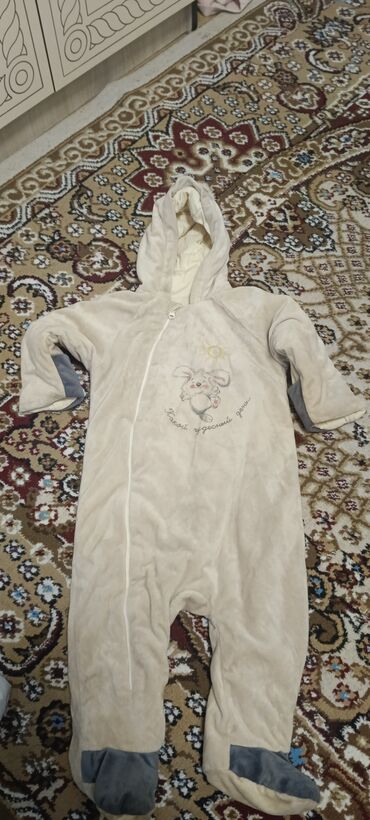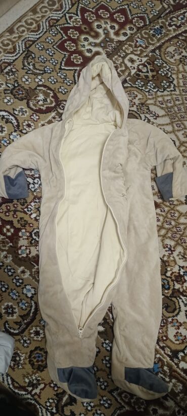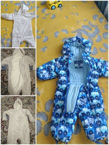 Оба изделия подходят для прогулок в прохладную погоду: синий — как верхний зимний слой, бежевый — как тёплый поддевочный/домашний. Размер синего — 74; бежевый ориентирован на младенца схожего роста.