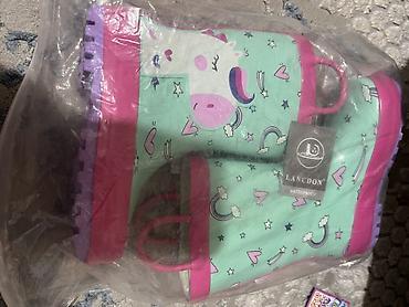 - Цвета: мятный верх с принтом единорога, сердечек, звёзд и радуг; розовая окантовка и подошва; фиолетовая протекторная часть подошвы
