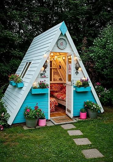 - Конструкции на выбор: классический с крыльцом, A‑frame (дом‑шалаш), домик с террасой и декоративной росписью, вариант с игровой площадкой, горкой и лестницей.