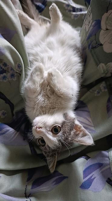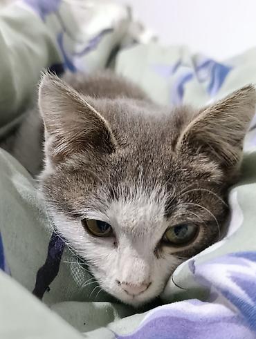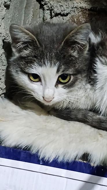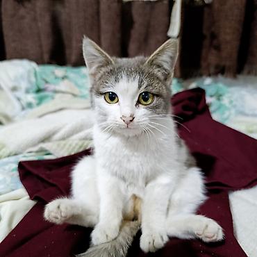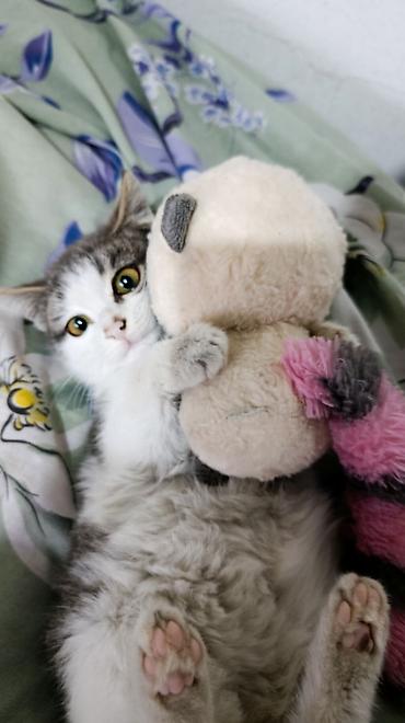 Домашний котёнок, серо-белый окраса (биколор). Крупные выразительные глаза, розовые подушечки лап, пушистый хвост. Компактный, аккуратный, любит сворачиваться клубочком и лежать на спине, легко идёт на контакт, охотно играет с мягкими игрушками. Подойдёт для квартиры: спокойно переносит укутывание, позволяет себя гладить и брать на руки. Питается влажным и сухим кормом, приучается к лотку. Отличный компаньон для семьи с детьми: ласковый, общительный, ориентирован на человека, любит внимание и игры.
