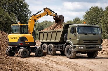 Техника: колесный экскаватор Hyundai с ковшом для погрузки сыпучих материалов; самосвалы КАМАЗ с усиленными бортами и большим объёмом кузова — подходят для интенсивной перевозки грунта и инертных материалов.