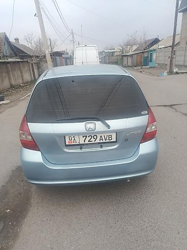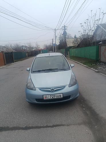 Honda Fit (Jazz) хэтчбек, светло-голубой цвет кузова. Компактный городской автомобиль с пятидверным кузовом и тонированными стеклами. Легкосплавные диски, задний дворник, антенна на крыше. Номерные знаки KG (01). Практичный салон с высокой посадкой и хорошей обзорностью, удобный багажник с высокой дверью. Экономичный и надежный, удобен для города и повседневных поездок.