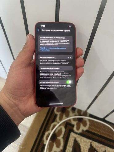 - Аккумулятор: максимальная ёмкость 77% (информация из раздела «Состояние аккумулятора» на фото), активна «Оптимизированная зарядка»