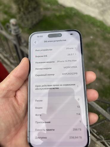 IPhone 14 Pro Max, 256 ГБ, цвет Deep Purple. Характеристики и детали по фото: - Память: 256 ГБ (доступно ~175 ГБ). - iOS: 16.1 (указано в разделе «Об этом устройстве»). - Номер модели: MQ8A3ZA/A. ...