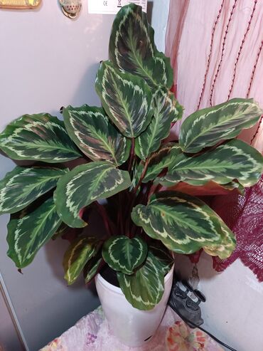 Комнатное растение калатея с характерными узорчатыми листьями. Листья имеют зеленую окраску с выраженными светлыми узорами на верхней стороне и красновато-пурпурной нижней стороной, что придает растению декоративный вид. Растение находится в белом горшке, что создает контраст с насыщенными цветами листвы. Калатея подходит для украшения интерьера дома или офиса, добавляя живые акценты и тропическую атмосферу.