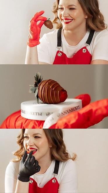 - Свежая крупная клубника, покрытая бельгийским шоколадом: темным, молочным и белым. Декор – шоколадные линии, сердечки, ягодные дольки, съедобное золото, посыпки и миндальные лепестки.