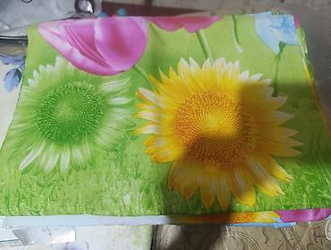 - Принт: яркий цветочный рисунок (подсолнухи, тюльпаны, полевые цветы) на голубом и салатовом фоне; в наборе также однотонная наволочка с фактурным светло-коричневым рисунком и кружевным орнаментом по краю