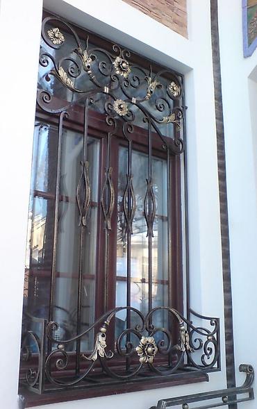 - Оконные решетки: наружные и накладные, прямые и выносные (с цветочницей), с флористическими элементами, завитками, ромбами и вертикальными прутьями.