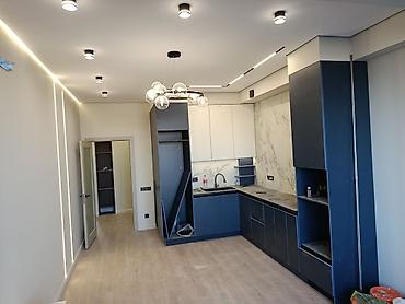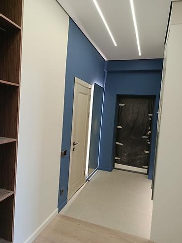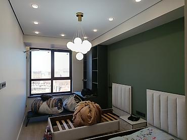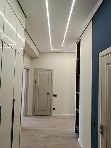 - Отделка: светлые стены с акцентными окрашенными зонами (синий и оливковый), потолки с встраиваемыми и линейными светодиодными светильниками, точечные и накладные светильники, декоративные световые линии по периметру.