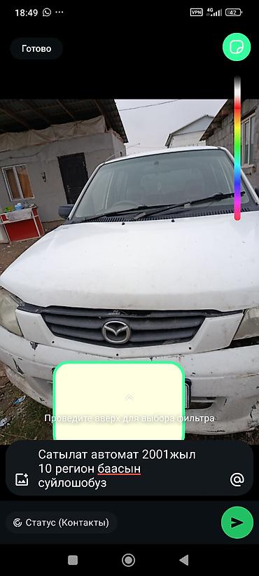 Mazda (минивэн/универсал), 2001 год выпуска, автоматическая коробка передач. Белый цвет кузова. Передняя оптика галогеновая, пятидверный кузов, задняя дверь с вертикальным открытием. Салон рассчитан на несколько пассажиров, высокий потолок и большой багажник — удобно для семьи или перевозки грузов.