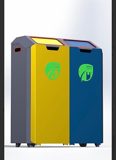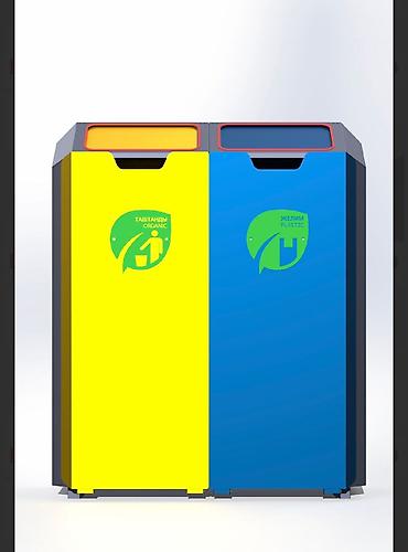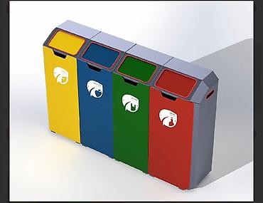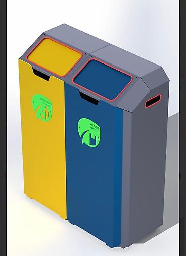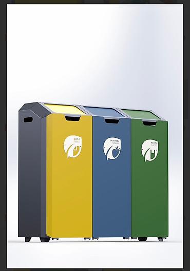 - Система секционных урн с цветовой маркировкой фракций: органика (желтый), пластик (синий), стекло (зеленый), металл (красный) и др. Возможны комплекты из 1, 2, 3 и 5 секций.