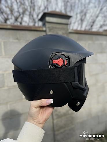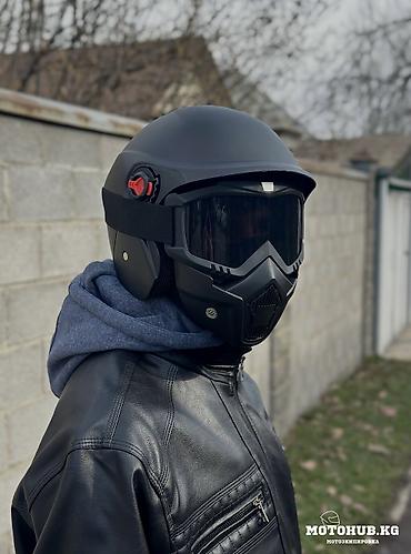 - Форм-фактор: открытый шлем с козырьком, комплектуется съёмной лицевой маской и интегрированными мотооочками.