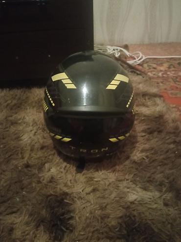 Мотошлем интеграл TRON, черный с желтыми графическими элементами.