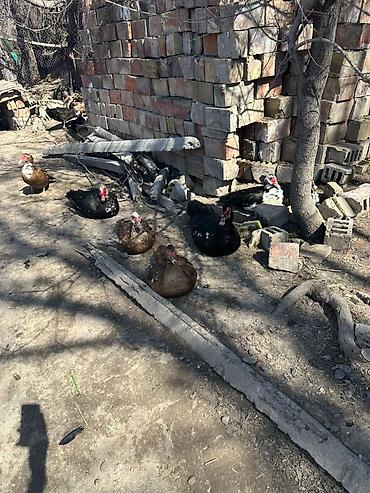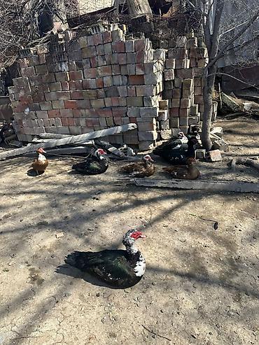 Мускусные утки (индоутки), разноцветные окрасы: черный с белыми вкраплениями, коричневый, серый, пестрый. На фото — взрослые особи разного пола в небольшом стаде.