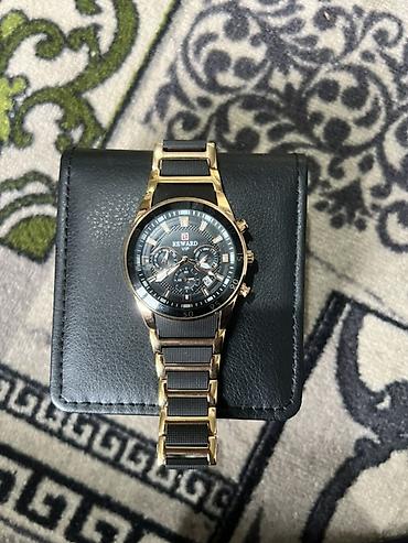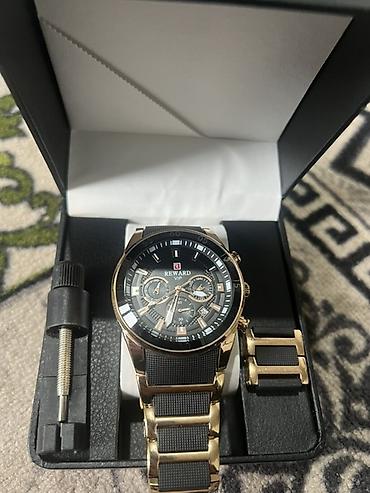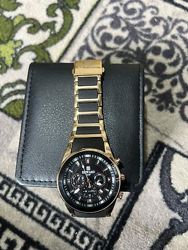 - Корпус и браслет: комбинированное исполнение в золотистом тоне с черными вставками; металлический браслет с звеньями, застежка с логотипом REWARD.