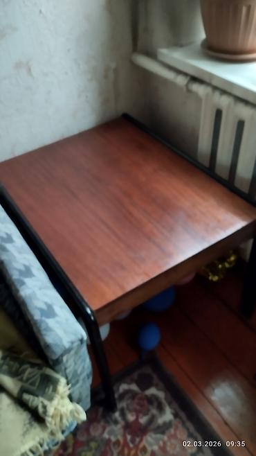 - Журнальный/кофейный столик квадратной формы: столешница под дерево, металлический каркас и ножки, компактный размер — удобно как придиванный или для небольших пространств.
