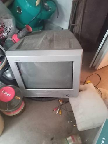 - Телевизор Sony кинескопный (серебристый корпус). На панели — AV-входы через тюльпаны (композитные разъёмы), есть фронтальные кнопки управления и ИК-приёмник для пульта.