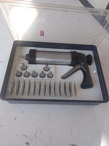 - Кондитерский шприц в кейсе. Металлический цилиндр, пистолетная рукоятка, регулировочное колесо на торце, набор насадок: круглые/фигурные для крема и украшений, а также длинные плоские насадки для печенья. Хранится в жестком пластиковом футляре с прозрачной крышкой.