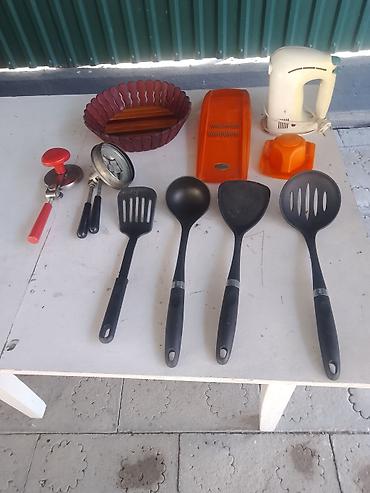 - Подборка кухонных инструментов: открывалка для банок, резак/формочка, шумовка, лопатка, половник, ложка-половник, овощерезка/терка с защитным толкателем, пластиковая миска/корзинка, ручной миксер с двумя скоростями (компактный корпус).