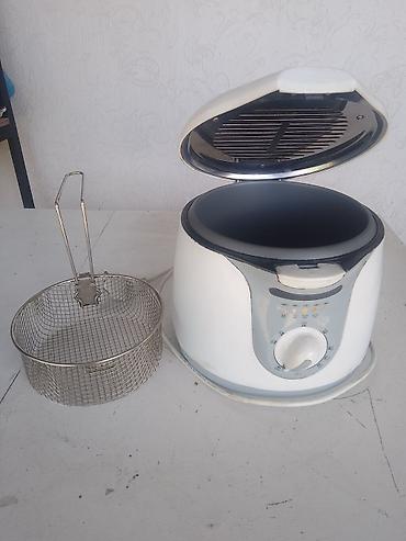 - Электрофритюрница с металлической корзиной. Съемная корзина с длинной ручкой, индикатор температурных режимов на панели (примерные метки 150–190 °C), смотровая крышка с металлической решеткой внутри, чаша с антипригарным покрытием.